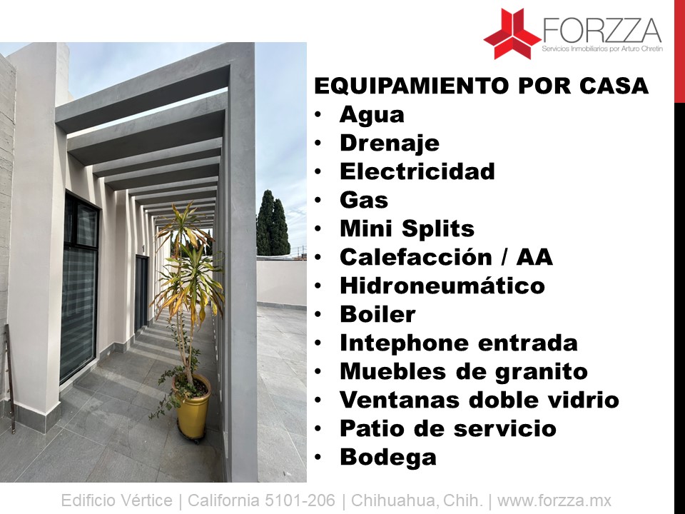 - Equipamiento de cada casa: Agua, drenaje, electricidad, gas, mini Splits, calefacción / AA, hidroneumático, boiler, intephone entrada, muebles de granito, ventanas doble vidrio, patio de servicio y bodega.